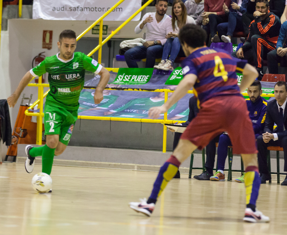 Con el grato recuerdo en la retina del empate logrado en la primera vuelta en el «Palau», las circunstancias para el UMA Antequera con la visita del Barcelona habían empeorado desde entonces de manera más que sustancial debido, principalmente, por el reducido número de jornadas que restan para la conclusión, el calendario tan complicado que tenía por delante y por no depender, básicamente, de si mismo para la obtención del logro. Demasiados inconvenientes para un equipo, que eso sí, desde el inicio de liga sabía sus limitaciones pero también conocía su gran arma, que no era otra que la de dejarse la vida en cada envite mientras hubiera vida en competición, precisamente lo que volvieron a hacer los de Moli frente al todopoderoso equipo de Marc Carmona, rival ante los que sabían que todo lo que no fuese puntuar podría ser elemento que adelantara un poquito más el desenlace de un descenso contra el que este equipo iba a luchar hasta el final dejándose la vida en el empeño. Y ya de inicio y a las primeras de cambio lo intentó Claudio con un botepronto que se fue a la madera de Cristian. Sin embargo Aicardo, con mucha fortuna hace el primero tras tocar su disparo la espalda de un rival (M.4). La respuesta no se hace esperar y Armando en gran acción personal empata (M.5).