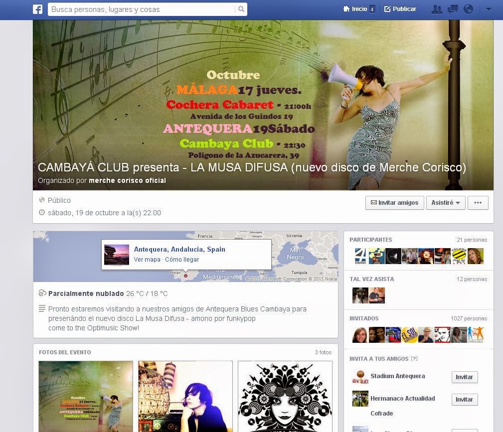 Para el sábado 19 podemos disfrutar de otro concierto en el Cambayá Club, enviado por Merche Corisco Oficial, a las 22:00 horas para la presentación de «La Musa Difusa» el nuevo disco de Merche Corisco que interpreta Funkypop.
