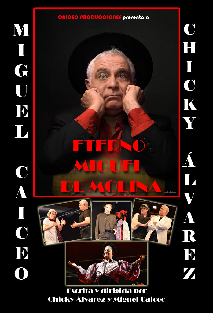 ‘Eterno Miguel de Molina’ es un espectáculo cómico-músical que según narra su organizador, ‘La Cochera Producciones’, narra cómo un desconocido se cuela en la casa de un avejentado Miguel de Molina. El cantante se desconcierta ante la presencia del Intruso en su casa, porque no sabe cómo ha podido entrar, dado que él es muy celoso de su intimidad y en su hogar no entra nadie desde hace años. Sin embargo, el cancionista, lejos de enfadarse y echarlo de su casa, como es habitual en él, se deja seducir por su sonrisa y comienza a hablar con el Intruso, como si se tratara de un familiar cercano. Aunque a priori Miguel no sabe quién es el extraño, cree haberlo visto antes, pero no una vez, sino muchas veces, ya que su cara le resulta muy conocida. El cantante revive con el visitante los momentos más importantes de su vida, sin dejar de escudriñar en su pasado, para intentar averiguar dónde ha coincidido con el Intruso. Miguel de Molina hace un recorrido de toda su vida, sin saber que en breves momentos va a morir.