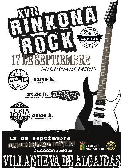 Villanueva de Algaidas celebra este sábado 17 de septiembre la décimo séptima edición del Rinkona Rock que este año reunirá en el Parque Arenal a los grupos Dry Surfers, Dando La Nota y Furia Trinidad, organizado por el Ayuntamiento en colaboración con la asociación deportiva Motoclub N-331 y la asociación musical Sonora Club. Habrá servicio de barra.