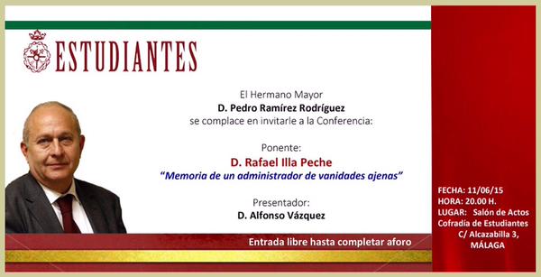 La presentación de D. Rafael Illa correrá a cargo del periodista malagueño D. Alfonso Vázquez; actuando como moderador el Hermano Mayor de la Cofradía, D. Pedro Ramírez. La entrada será libre, hasta completar aforo.