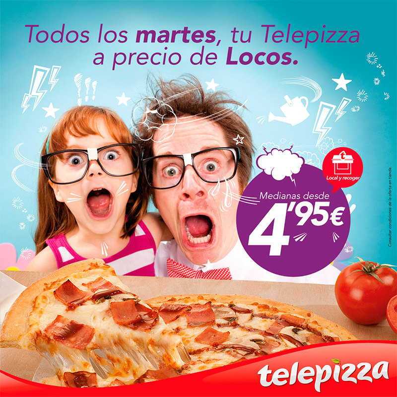 OcioComida para llevar Este martes, tu pizza a precio de locos en Telepizza Antequera Por Redacción Las 4 Esquinas - 12 de septiembre de 2016 19 715 FacebookTwitterPinterestWhatsApp Este martes disfruta de la promoción Martes Locos de Telepizza con pizzas medianas desde 4,95 € en local y recoger. Pregunta las condiciones en nuestro establecimiento. Calle Infante Don Fernando, 41 teléfono 952 70 20 48 PUBLICIDAD