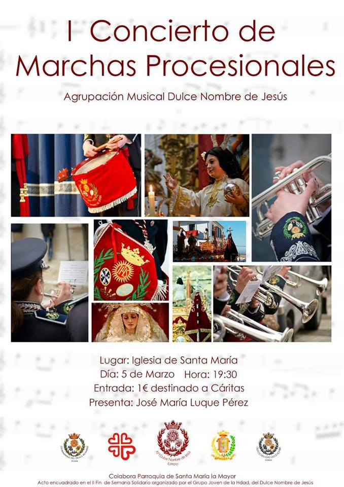 Este sábado 5 de Marzo a las 19.30 horas el Grupo Joven de la Cofradía del Dulce Nombre de Jesús y María Santísima del Socorro de Campillos organiza el primer concierto de marchas procesionales de la Agrupación Musical Dulce Nombre de Jesús el cual tendrá lugar en la Iglesia de Santa Maria con entrada de 1 euro destinada a Cáritas. Presentará el concierto José Maria Luque Pérez.