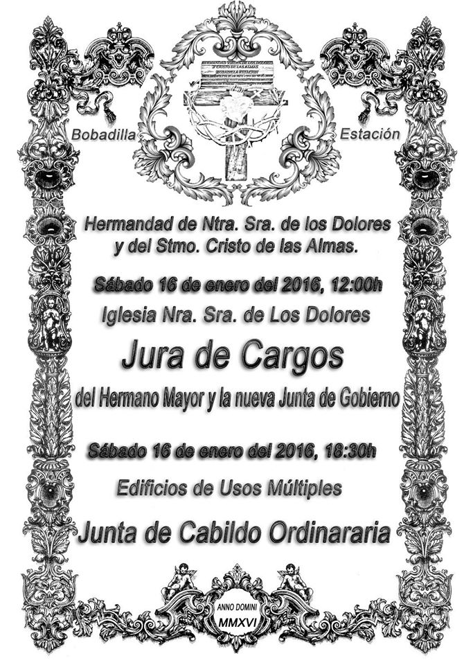 Dichos actos tendrán este sábado 16 de Enero como día principal donde a las doce del mediodía en la Iglesia de Nuestra Señora de los Dolores el Hermano Mayor y su nueva Junta de Gobierno juraran cargos.