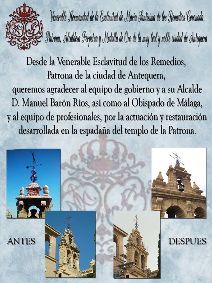 Desde la Venerable Esclavitud de los Remedios, Patrona de Antequera, quieren agradecer al equipo de gobierno y a su Alcalde, Manuel Barón, así como al Obispado de Málaga y al equipo de profesionales por la actuación y restauración desarrollada en la espadaña del templo de la Patrona.