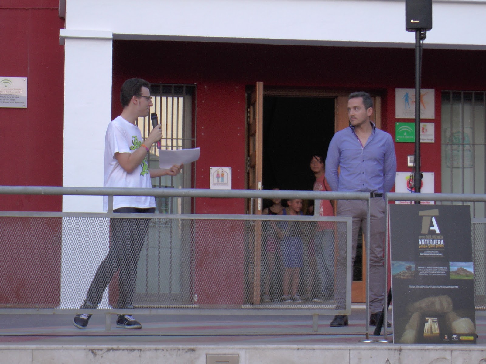 Francisco Javier Palomo, secretario de COLEGA Antequera, subió al escenario para entregar un diploma acreditativo en forma de agradecimiento por la participación de Fernando González, Coqui García y Ramón Jiménez en la lectura del Manifiesto.