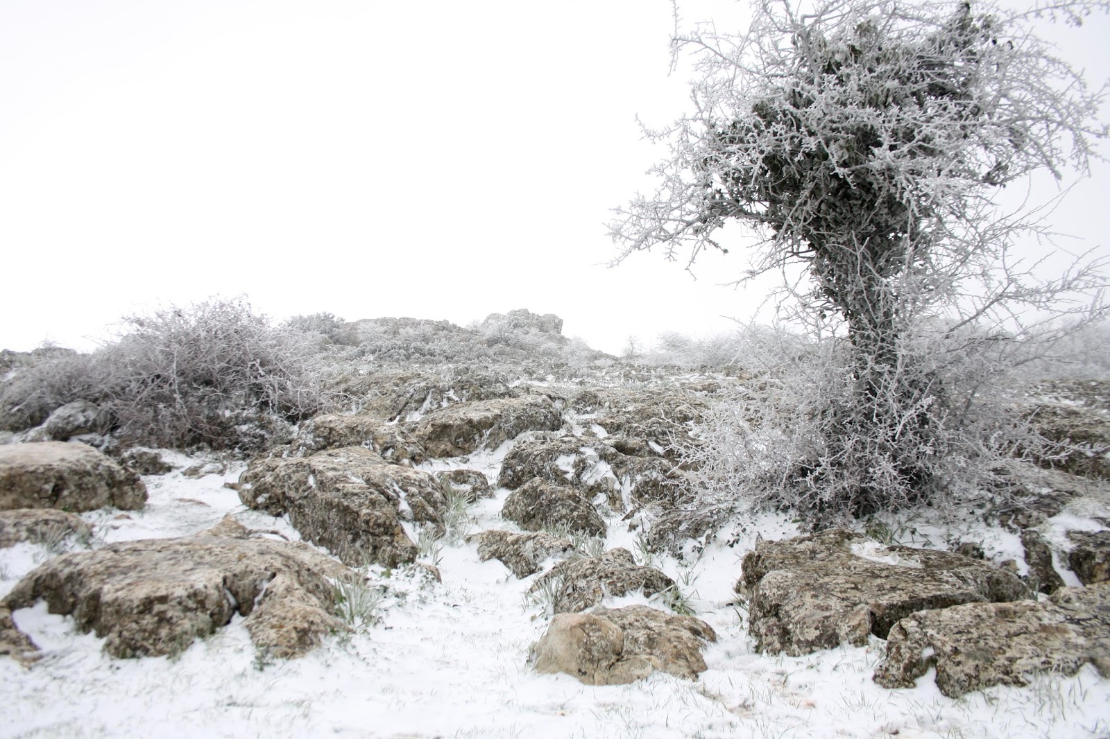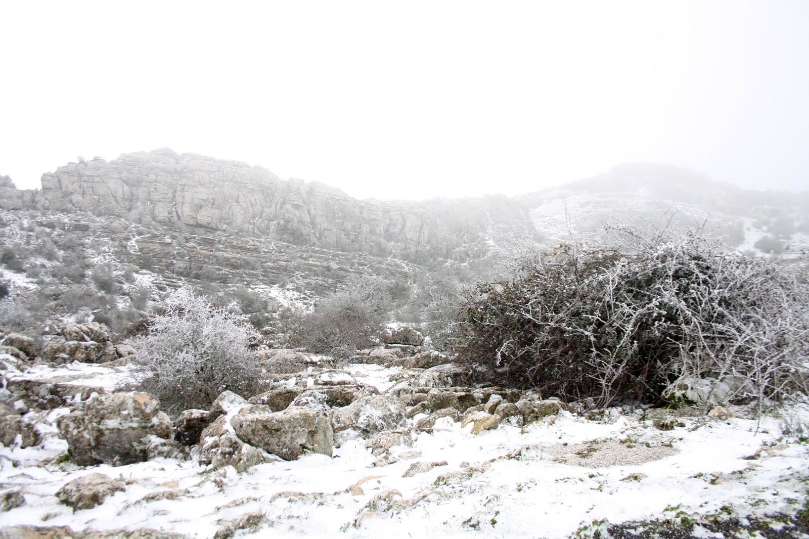 Se esperaba que el Torcal de Antequera hoy luciera nevado, y esta vez no ha decepcionado. A las nueve de la mañana han empezado a caer copos de nieve que poco a poco han ido cuajando y pintando de blanco el paisaje antequerano.