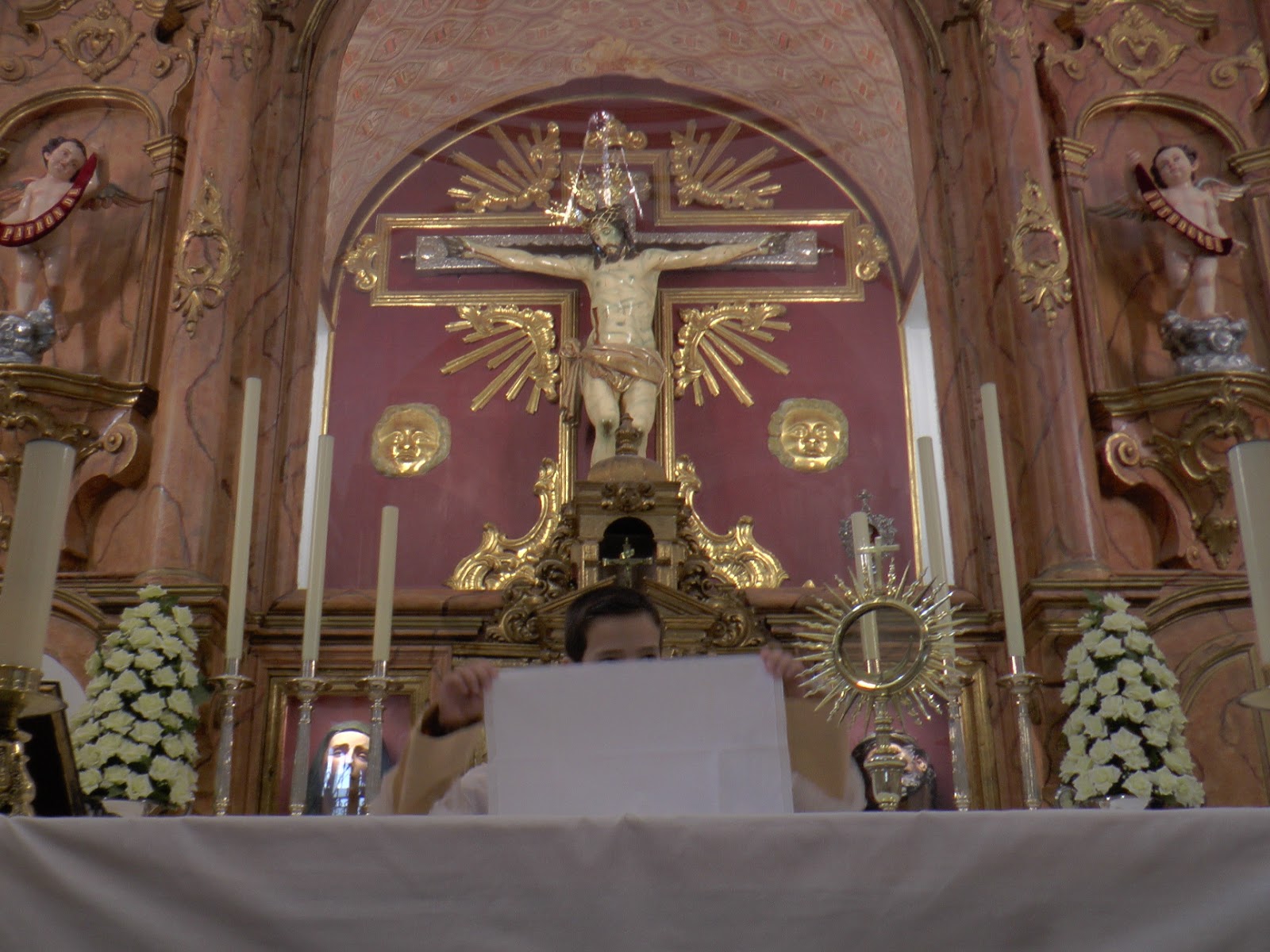 A las doce del mediodia comenzaba la Función Religiosa celebrada por el párroco don Tomás Pérez Juncosa tras la cual comenzaba la procesión del Santisimo por las naves del templo hasta salir por la puerta lateral a Cuesta Real, el cortejo continuó entrando a la nueva plaza remodelada de San Juan donde la Hermandad montó el Altar muy parecido al que este año montaron con motivo del Corpus en calle Lucena.