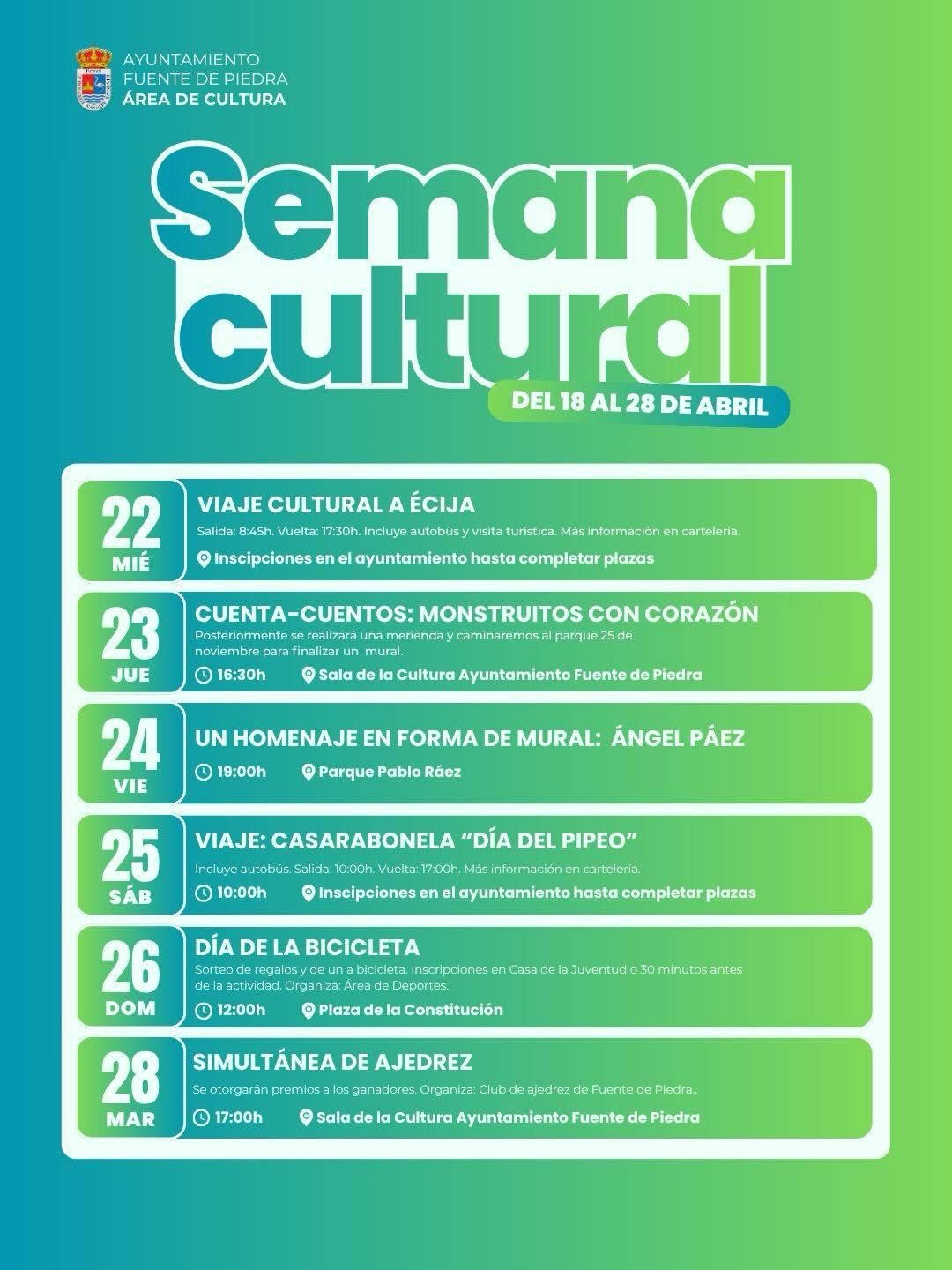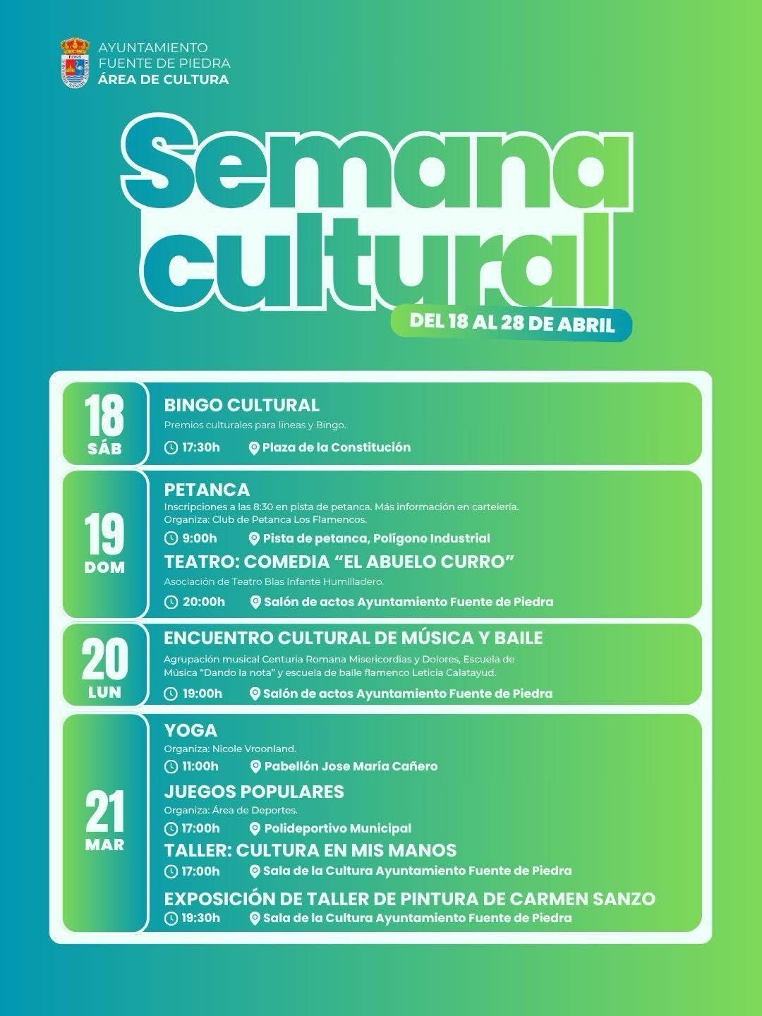 El alcalde de Fuente de Piedra, Siro Pachón, y la concejala de Cultura, Ana Belén Cuadrado, han dado a conocer de forma oficial el calendario de eventos para la Semana Cultural 2026. La programación, que se desarrollará entre el 18 y el 28 de abril, contempla una amplia variedad de propuestas que abarcan desde el fomento de la lectura hasta competiciones deportivas y viajes.