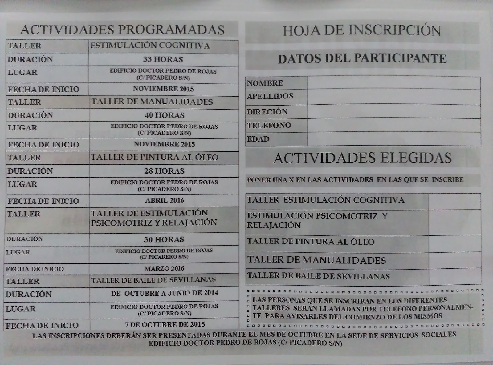 El plazo de matriculación está abierto desde hoy día 1 de octubre hasta el día 30 del mismo mes. La inscripción debe hacerse en la sede de servicios sociales Edificio Doctor Pedro De Rojas (C/Picadero s/n).
