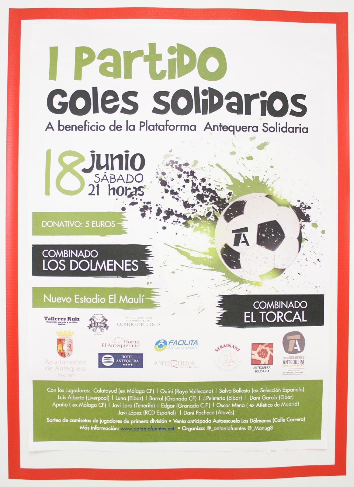 El deporte y la solidaridad se suman para celebrar el próximo día 18 de junio el ‘I Partido Goles Solidarios’ a beneficio de la Plataforma Antequera Solidaria, encuentro que tendrá lugar en estadio ‘El Maulí’ y que enfrentará al combinado ‘Los Dólmenes’ y al ‘El Torcal’, así lo ha explicado la concejal Mª Eugenia Galán.