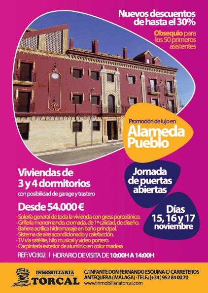 Durante los días 15,16 y 17 de Noviembre de 10:00 a 14:00 horas, Inmobiliaria Torcal organiza unas jornadas de Puertas Abiertas en el pueblo de la Alameda .