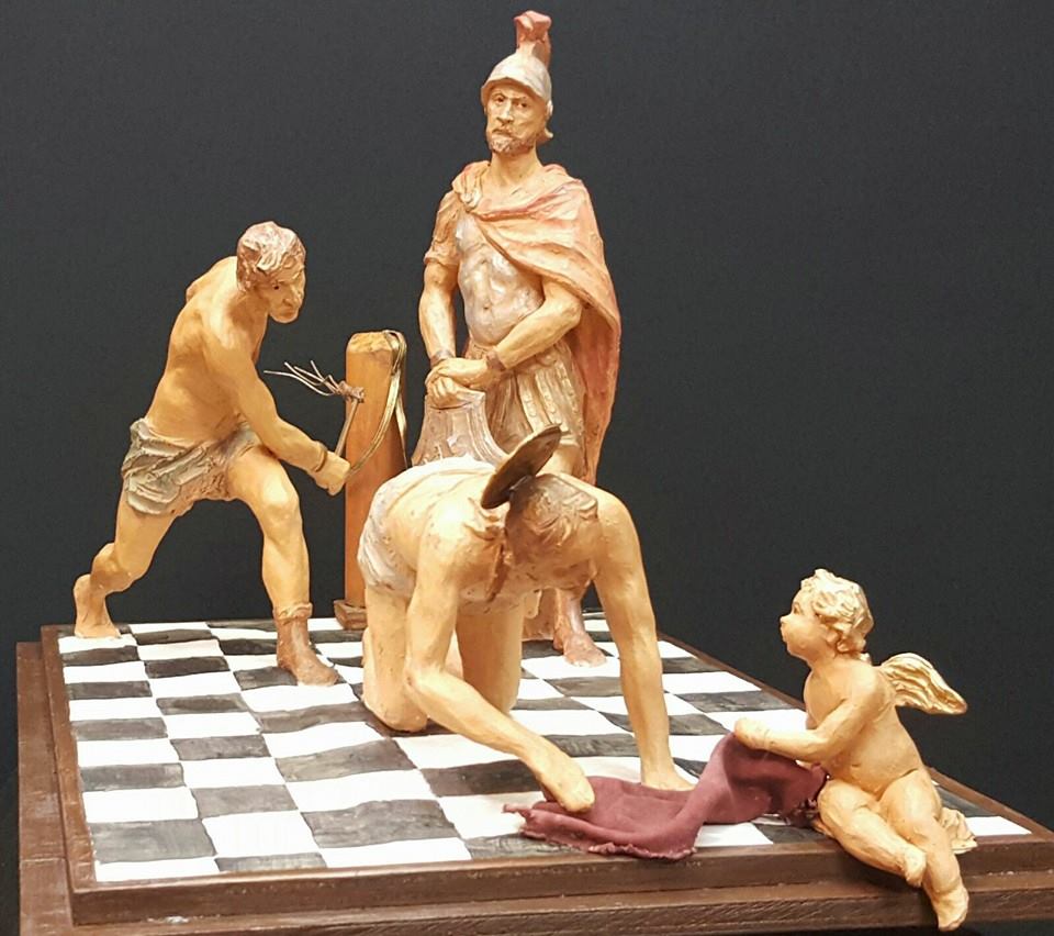 Al lado del sayón se incorporará a la escena, en actitud altiva, indiferente, y observando lo que acontece, un centurión romano apoyado en su escudo,(figura erguida y más hierática con gran carga psicológica en su rostro),de talla anatomizada en las partes visibles, para vestir con ropas propias de la época ricamente engalanadas, armadura, casco y escudo en plata, en cuyo centro aparecera grabado el escudo de Antequera.