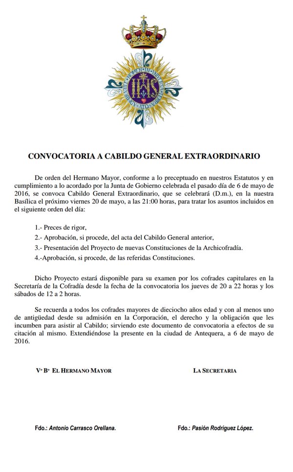 Por orden del Hermano Mayor, Antonio Carrasco Orellana, la Secretaria de la Archicofradía de Abajo, Pasión Rodríguez López hace saber convocatoria del Cabildo General Extraordinario que tendrá lugar el próximo Viernes 20 de Mayo a las nueve de la noche.