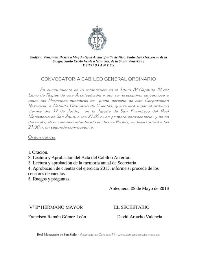 miembros de pleno derecho de esta Corporación a Cabildo Ordinario de Cuentas