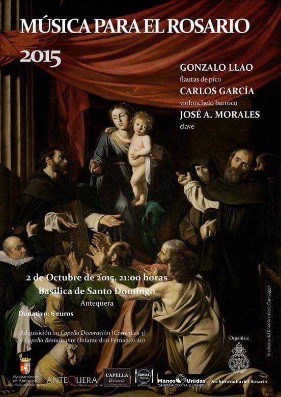 Tras la iniciativa del año pasado, la Archicofradía del Rosario de Antequera organiza una nueva edición del Acto Musical «Musica para el Rosario» que este año pondrá acordes a través de los músicos Gonzalo Llao, a la flauta de pico, Carlos García, al violonchelo barroco y Jose Antonio Morales, en la clave.