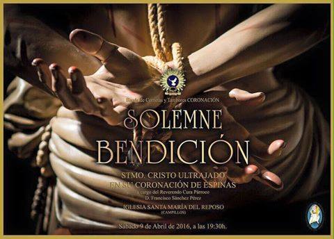 19:30 h. Solemne Eucaristía de Bendición de la imagen del Santísimo Cristo Ultrajado en su Coronación de Espinas presidida por sacerdote don Francisco Sánchez Pérez, Párroco de Santa María del Reposo. A continuación, se realizará el primer Besapié de la Sagrada Imagen en la Iglesia Parroquial de Santa María del Reposo.
