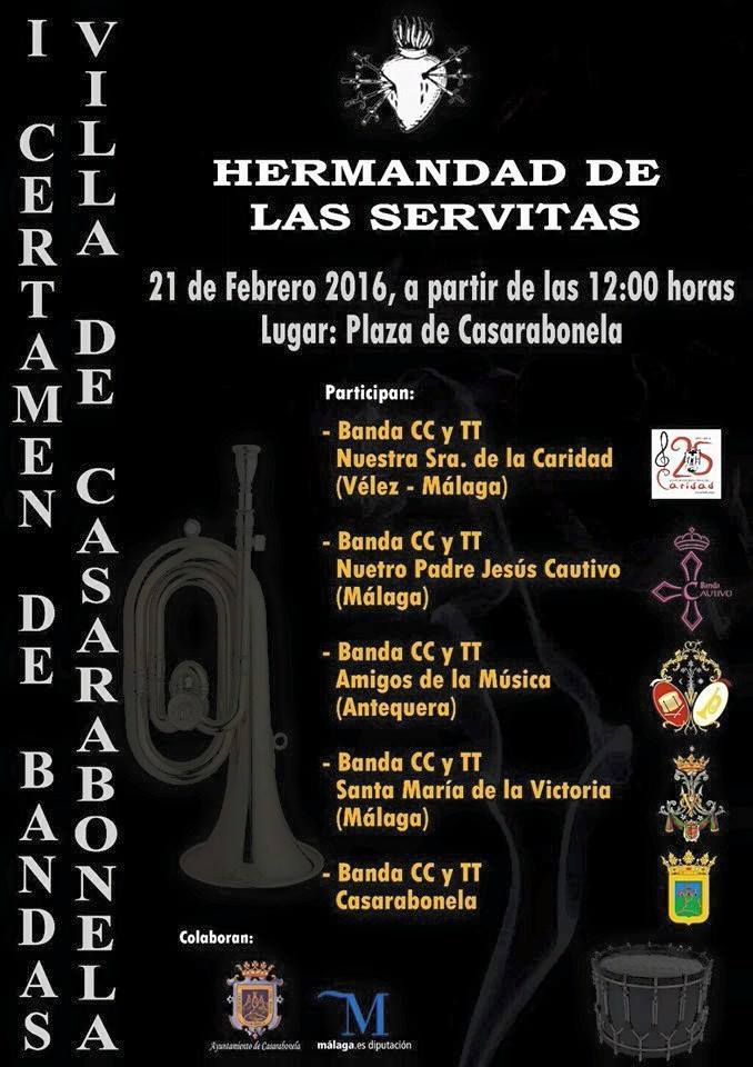 La Hermandad de las Servitas de Casarabonela organiza el primer certamen de bandas «Villa de Casarabonela» el cual tendrá lugar el proximo domingo 21 de Febrero a partir de las doce del mediodía en la Plaza del municipio malagueño.