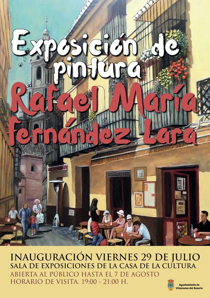 19.00 Inauguración Exposición de pintura de Rafael María Fernández Lara, en la Sala de Exposiciones de la Casa de la Cultura. Estará abierta al público hasta el 7 de agosto, en horario de 19:00 a 21:00 horas.