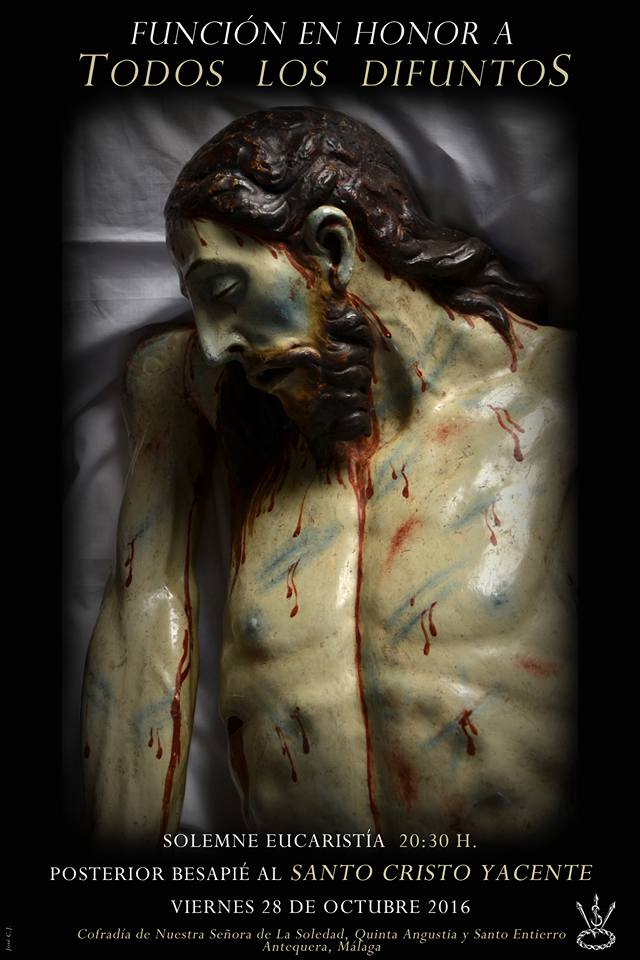 La Cofradía de Nuestra Señora de la Soledad, Quinta Angustia y Santo Entierro de Antequera organiza Función de Difuntos y en honor al Santo Cristo Yacente, la cual tendrá lugar el próximo Viernes 28 de Octubre a las 20.30 horas en la Capilla de la Soledad en el interior de la Iglesia del Carmen de Antequera. Tras la cual se procederá a Solemne Besapie al Sagrado Titular como se viene desarrollando en los últimos años.