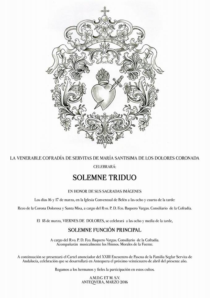 La Cofradía de María Santísima de los Dolores de Antequera cierra la Agenda de Cultos Cuaresmales en Antequera con la celebración de su Solemne Triduo los próximos miércoles 16, jueves 17 y viernes 18 de Marzo.