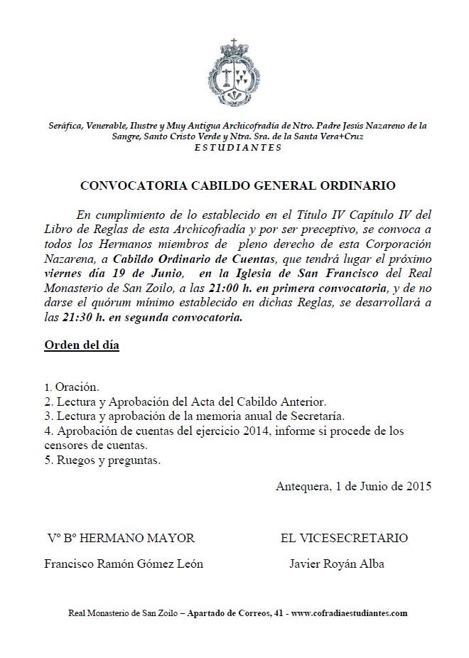 La Archicofradia de los Estudiantes de Antequera en cumplimiento de lo establecido en el titulo IV Capitulo IV del Libro de Reglas de esta Archicofradia y por ser preceptivo convoca a todos los hermanos miembros de esta Corporación Nazareno al Cabildo Ordinario de Cuentas que tendrá lugar el próximo Viernes 19 de Junio a las 21.00 en primera convocatoria y 21.30 en segunda en la Iglesia de San Francisco del Real Monasterio de San Zoilo, con el siguiente orden del día: