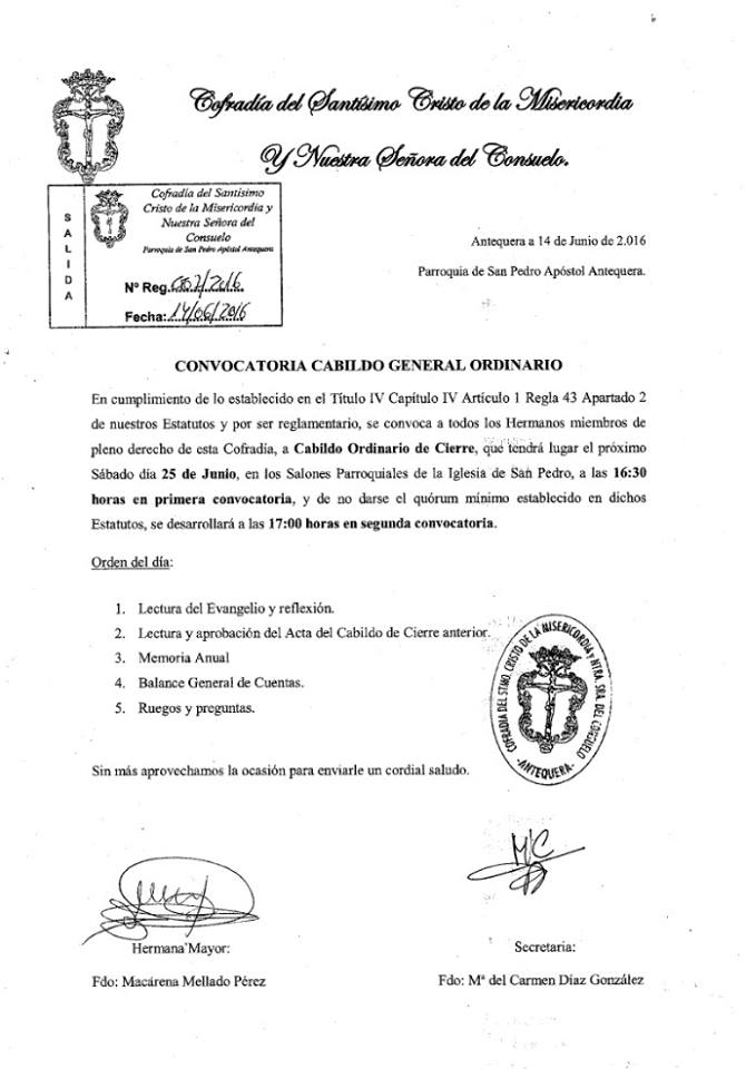 La Cofradía del Santísimo Cristo de la Misericordia y Nuestra Señora del Consuelo de Antequera, convoca Cabildo General Ordinario en Cumplimiento de lo Establecido en el Titulo IV Capitulo IV Articulo 1 Regla 43 Apartado 2 de sus Estatutos y por ser reglamentario Cabildo Ordinario de Cierre que tendrá lugar el próximo sábado 25 de Junio en los Salones Parroquiales de San Pedro a las 16.30 horas en primera convocatoria y de no darse el quórum mínimo establecido en dichos Estatutos en segunda convocatoria a las 17.00 horas con el siguiente orden del día: lectura del Evangelio y Reflexión, Lectura y aprobación del Acta del Cabildo de Cierre Anterior, Memoria Anual, Balance General de Cuentas y Ruegos y Preguntas.