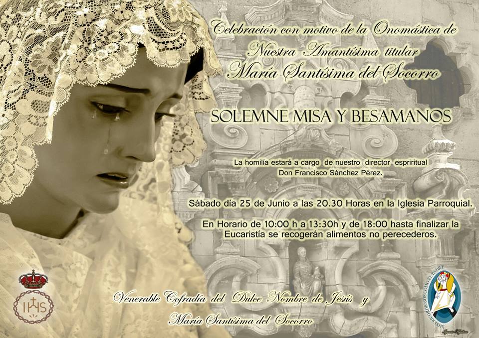 Con motivo de la Onomástica de María Santísima el Socorro la Cofradía del Dulce Nombre de Jesús de Campillos organiza Misa y Besamanos el próximo sábado 25 de Junio.