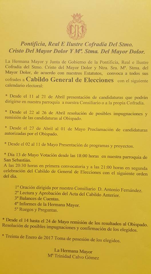 del Mayor Dolor y Nuestra Señora del Mayor Dolor de Antequera, de acuerdo con sus Estatutos, convoca a todos sus cofrades a Cabildo General de Elecciones con el