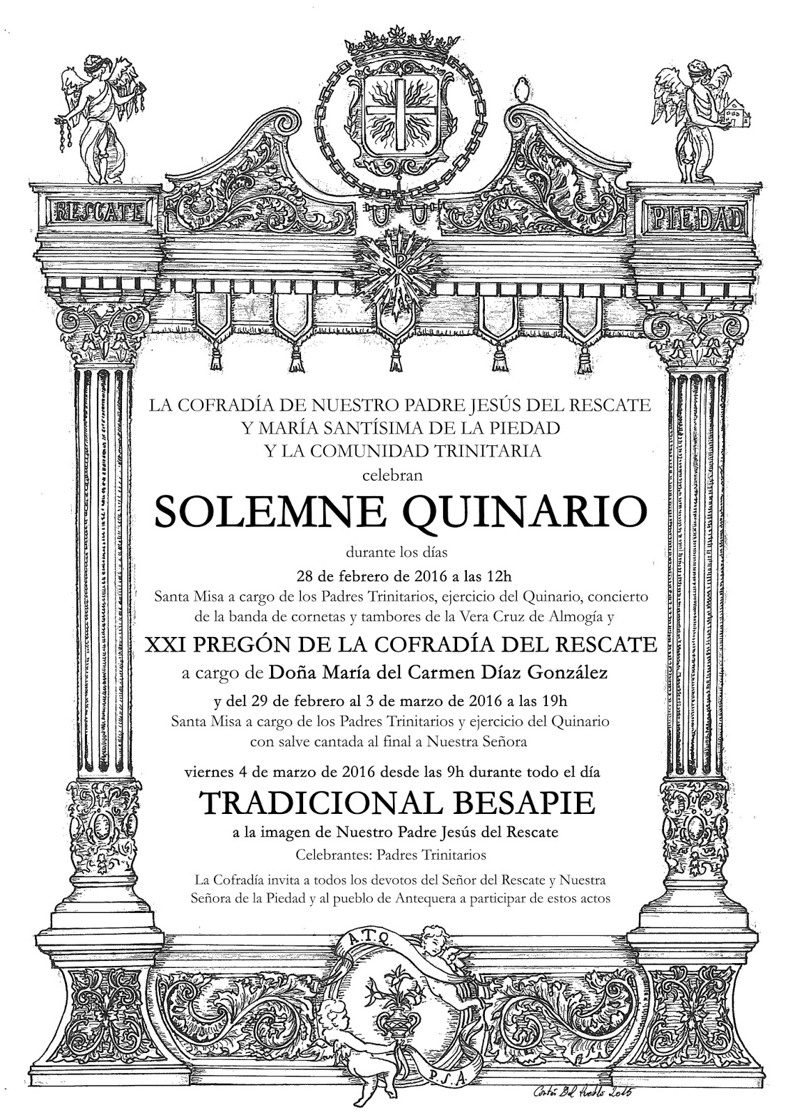 La Cofradía del Rescate de Antequera organiza Solemne Quinario a partir del 28 de Febrero a las 12.00 horas, con Santa Misa a cargo de los Padres Trinitarios, Ejercicio del Quinario, Concierto de la Banda CCTT Veracruz de Almogía y el XXI Pregón de la Cofradía a cargo de Maria del Carmen Díaz González.