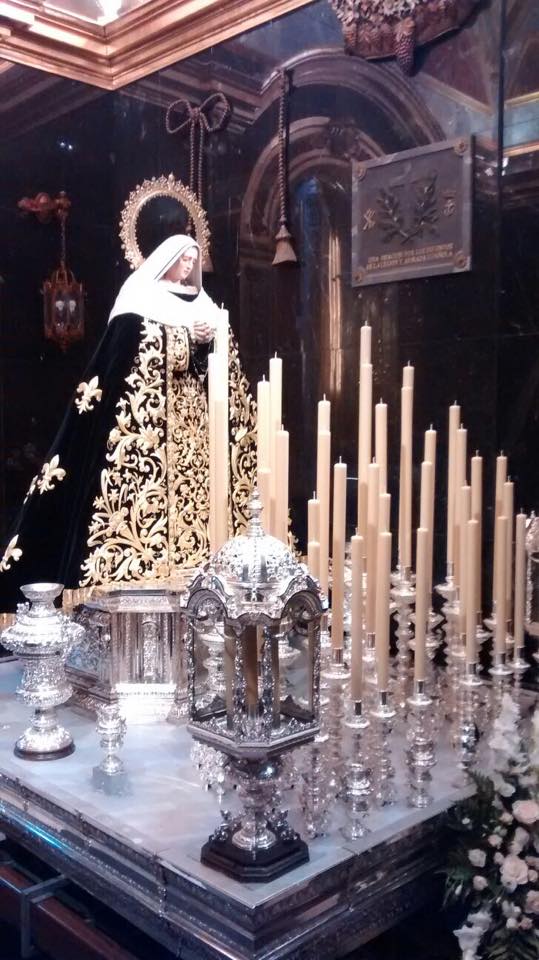 | Nuestra Señora de la Soledad, ya preparada en el Trono para el Traslado de este Viernes. |