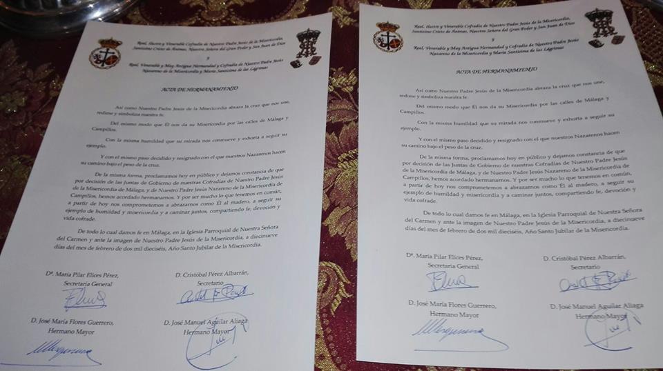 El pasado viernes, día 19 de febrero, tuvo lugar en la Parroquia de Nuestra Señora del Carmen de Málaga el acto de Hermanamiento de la Hermandad de Jesús Nazareno de Campillos con la Cofradía de la Misericodia de Málaga.