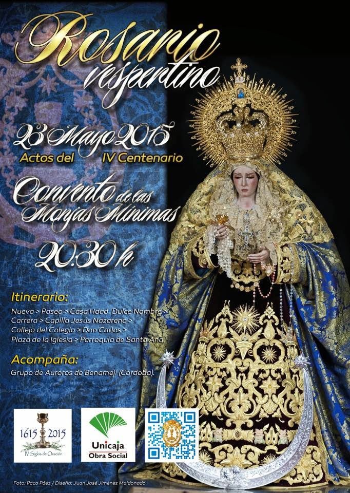 El próximo sábado 23 de mayo, y organizado por la Cofradía del Huerto de Archidona, tendrá lugar la celebración de un Santo Rosario vespertino, dentro del programa de actividades que se están llevando a cabo con motivo de la conmemoración del IV Centenario de la Cofradía.