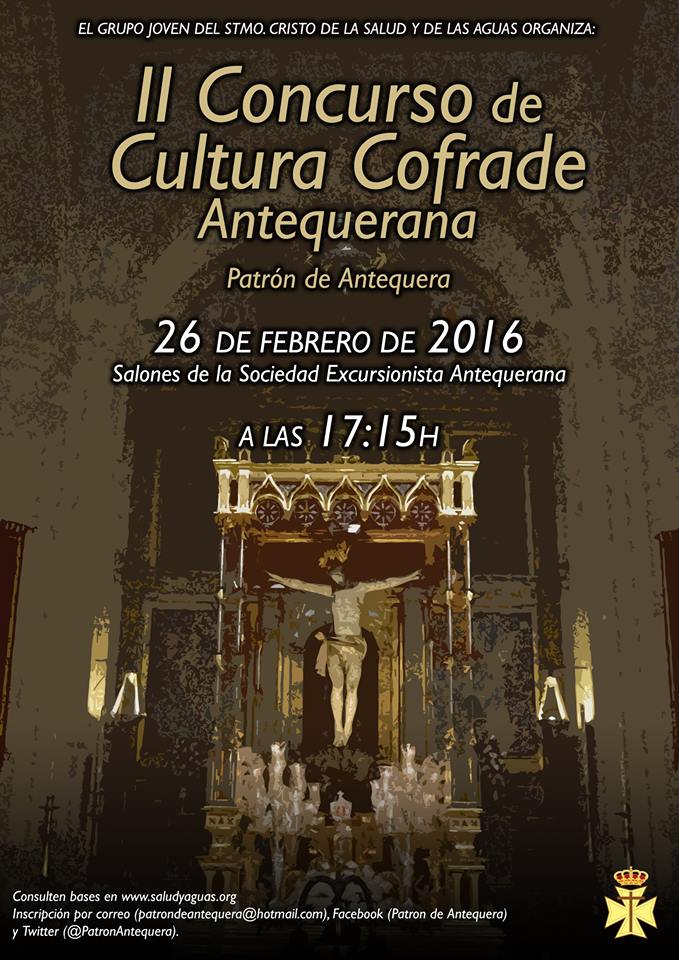 Este concurso lo organiza la Vocalía de Juventud de la Real Hermandad del Santísimo Cristo de la Salud y de las Aguas, Patrón de Antequera, por segundo año con el objetivo de promover la cultura y riqueza de las hermandades y cofradías de nuestra ciudad entre los más jóvenes de Antequera. De esta forma los jóvenes cofrades antequeranos podrán conocer más y mejor sus hermandades y cofradías.