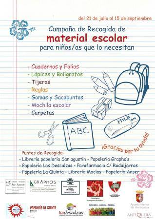 El material escolar deberá ser nuevo, pudiendose aportar libretas, mochilas, lápices, bolígrafos, colores, rotuladores, reglas, estuches y cuanto material complementario pueda necesitar un escolar.