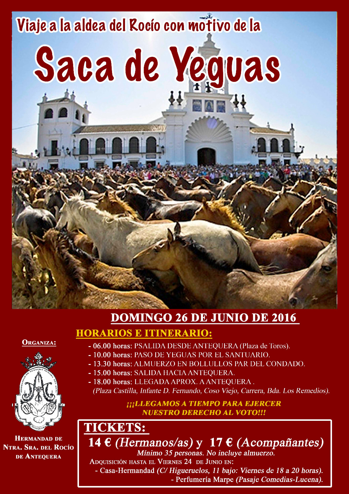 El horario de salida será a las 6.00 horas desde la Plaza de Toros. La Saca de Yeguas tendrá lugar a las 10.00 horas aproximadamente. Los viajeros que se apunten pasaran la jornada en la aldea del Rocío y almorzaran en Bollullos par del Condado. Finalmente se regresará hasta Antequera para estar a las 18.00 horas aproximadamente en la ciudad.