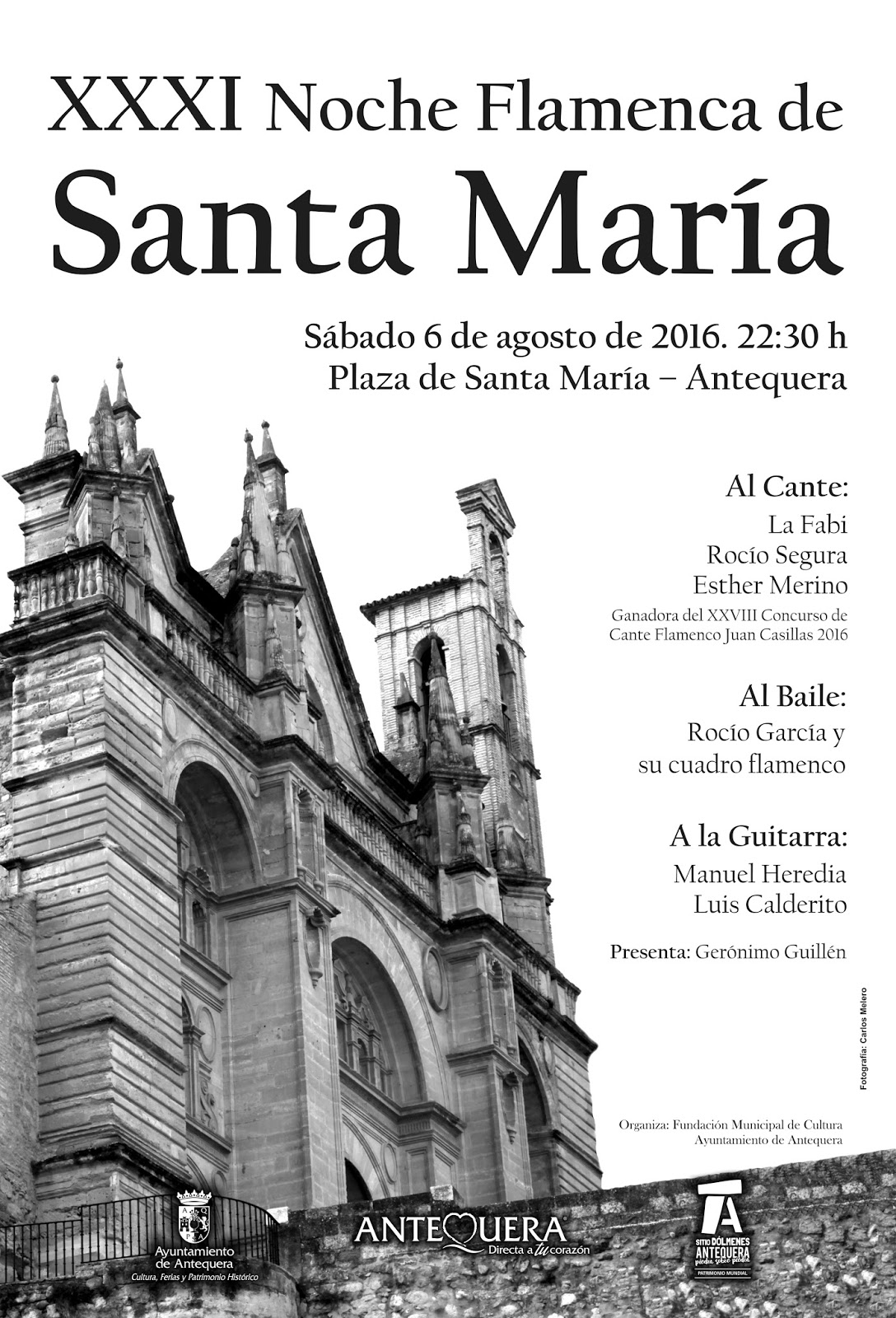 El entorno de la Real Colegiata de Santa María de Antequera sonará a flamenco al llegar la noche el próximo sábado seis de Agosto. Será a partir de las diez y media de la noche, cuando de comienzo la trigésimo primera edición de la Noche Flamenca de Santa María.