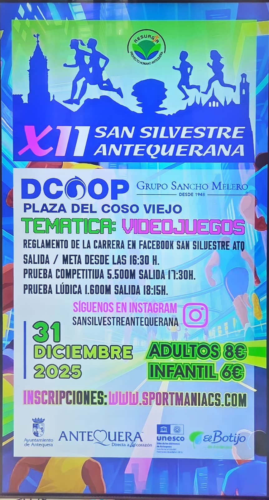 Antequera despedirá el año con su tradicional San Silvestre, que volverá a celebrarse este 31 de diciembre con un guiño muy especial al universo de los videojuegos. La prueba, organizada por la Asociación Resurgir Proyecto Humano, contará además con el respaldo de más de cien empresas locales y el apadrinamiento del Club Balonmano Los Dólmenes Antequera, junto al patrocinio de DCOOP y Grupo Sancho Melero.