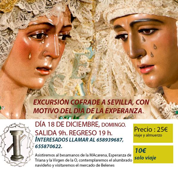 La sección de la Columna organiza viaje para el próximo domingo 18 de diciembre con motivo del día de la esperanza a Sevilla, para asistir al besamanos de la Macarena, de la Esperanza de Triana y la Virgen de la O. Así como contemplar el alumbrado navideño y el mercado de belenes. El precio del viaje será de 25 euros incluyendo almuerzo, o sólo 10 euros el viaje. Saldrá a las 9.00 y regresaran a las 19.00 horas. Para apuntarse llamar al 658939687 o al 655870622.