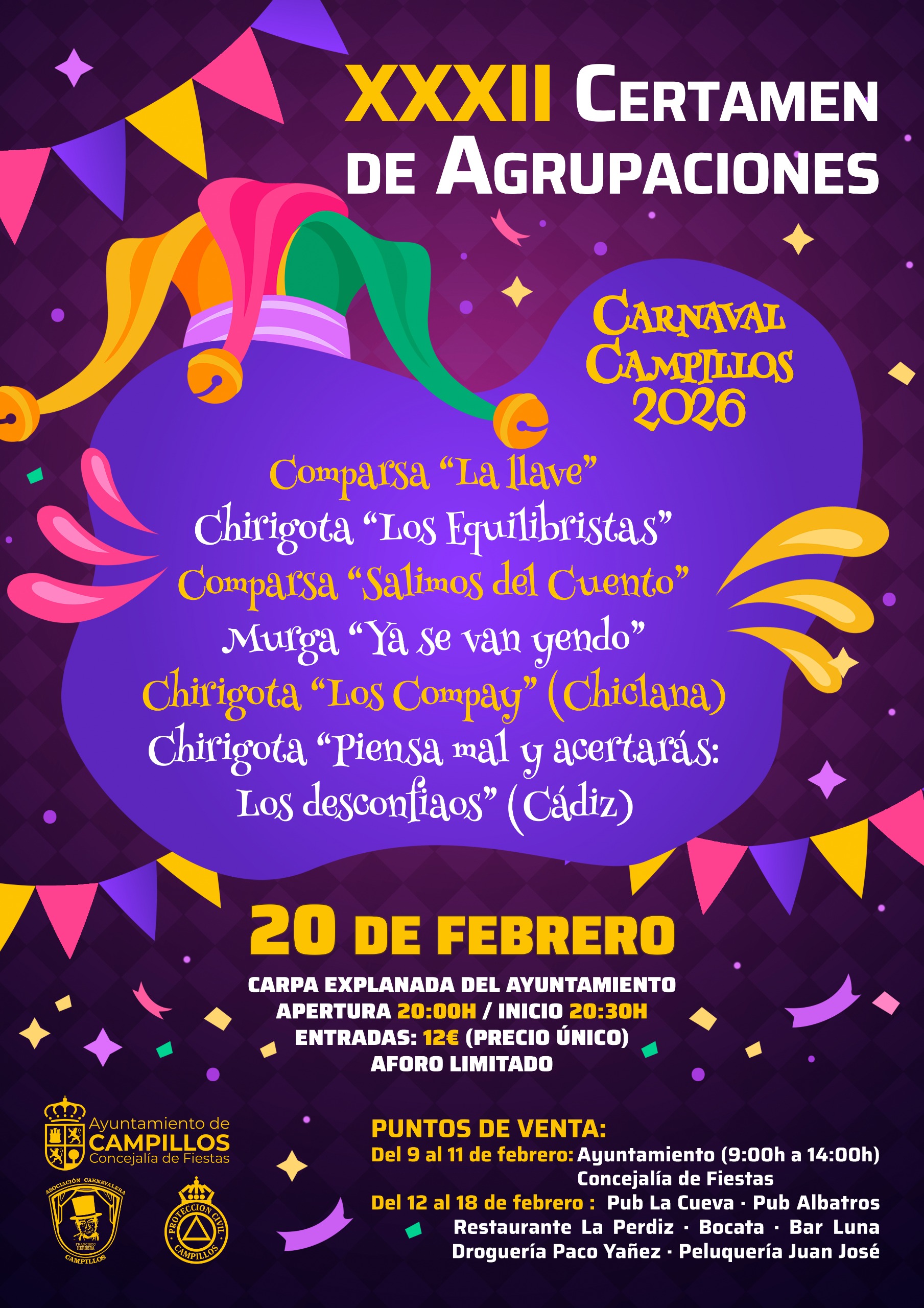 El humor, la sátira y el ritmo del 3×4 gaditano se darán cita en Campillos este febrero. El XXXII Certamen de Agrupaciones de Carnaval de Campillos ya tiene cartel oficial, destacando la presencia de dos de las agrupaciones más esperadas del Carnaval de Cádiz: las chirigotas de los Molina y los hermanos Villegas.