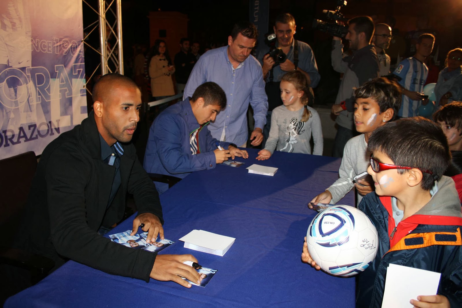 Los jugadores del Málaga CF Portillo y Tissone reciben a los aficionados antequeranos en la Plaza Castilla del municipio. La visita a la localidad ha comenzado con una recepción oficial en el Ayuntamiento donde el alcalde, Manuel Barón, ha recibido a los jugadores blanquiazules y al director general del Málaga CF, Vicente Casado, que ha estado acompañado del presidente de la peña malaguista de Antequera, José Manuel Castro. Además, la visita ha contado también con el edil de Deportes, Alberto Vallespín, los consejeros consultivos del Málaga CF, Antonio Benítez y Ben Barek, así como los técnicos Adrián Espárraga y Sergio Aguilar. Hacía dos años y medio que representantes del club y jugadores de la plantilla no venían a la ciudad a pesar de que la peña de Antequera es la segunda más antigua de la provincia. Así, lo ha resaltado el presidente de la misma quien ha pedido que la próxima visita sea en menos tiempo. El alcalde por su parte ha pedido al Málaga CF que vuelva a colaborar con el tradicional torneo local Ciudad del Torcal así como la creación de una escuela municipal del Málaga CF en la ciudad. Barón ha recordado que Antequera cuenta con la escuela municipal de fútbol más numerosa de toda la provincia con más de 500 alumnos. Casado ha reconocido la importancia que Antequera tiene para el club y ha confirmado que ya están estudiando la expansión de las escuelas deportivas y “entre las ciudades que se barajan está Antequera”. Además, el próximo 14 de diciembre todos los alumnos de la escuela de fútbol de Antequera estarán invitados al partido Málaga-Getafe que se jugará en la Rosaleda. La visita continúa en estos momentos con una multitudinaria firma por parte de los dos jugadores del Málaga en la plaza Castilla de la ciudad donde han acudido centenares de aficionados.