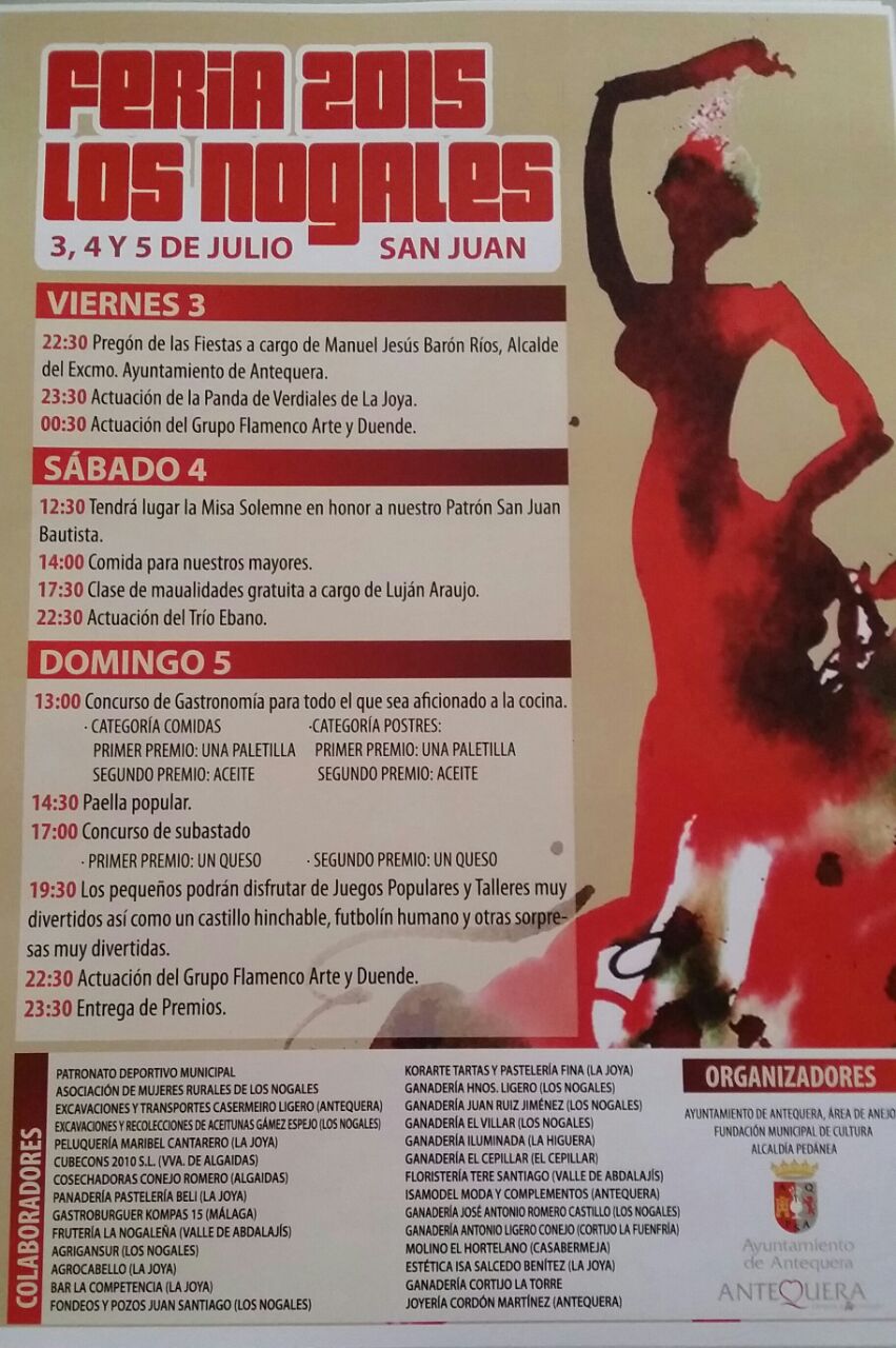 La Feria en los Nogales dará comienzo este viernes a las diez y media de la noche con el Pregón de las Fiestas a cargo de Manuel Jesús Barón Rios, Alcalde de Antequera. Tras el cual la fiesta dará comienzo con la actuación de la Panda de Verdiales de La Joya, para a las doce y media de la noche dar paso al Grupo de Flamenco Arte y Duende.