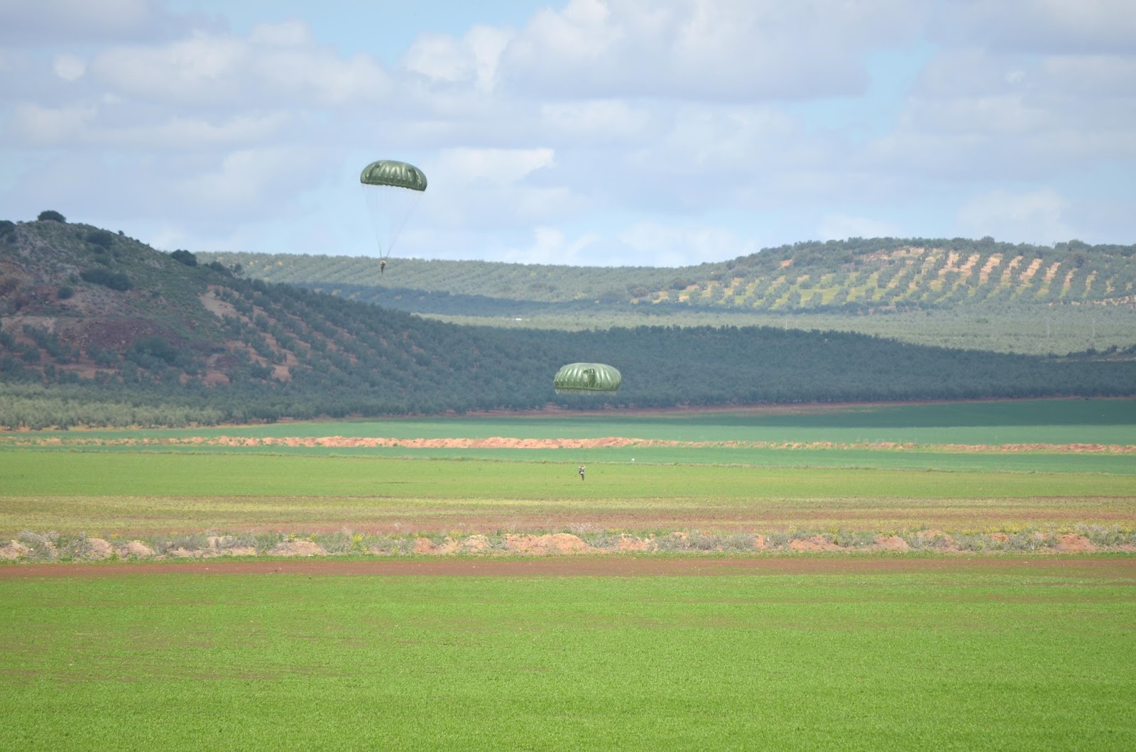 Ante la mirada de decenas de interesados, los militares han ido saltando de un avión del Ala 35 de Getafe en tres grupos de diez personas con paracaídas automáticos. Posteriormente, han realizado el salto cinco militares más, desde una altura mayor y con paracaídas manuales.