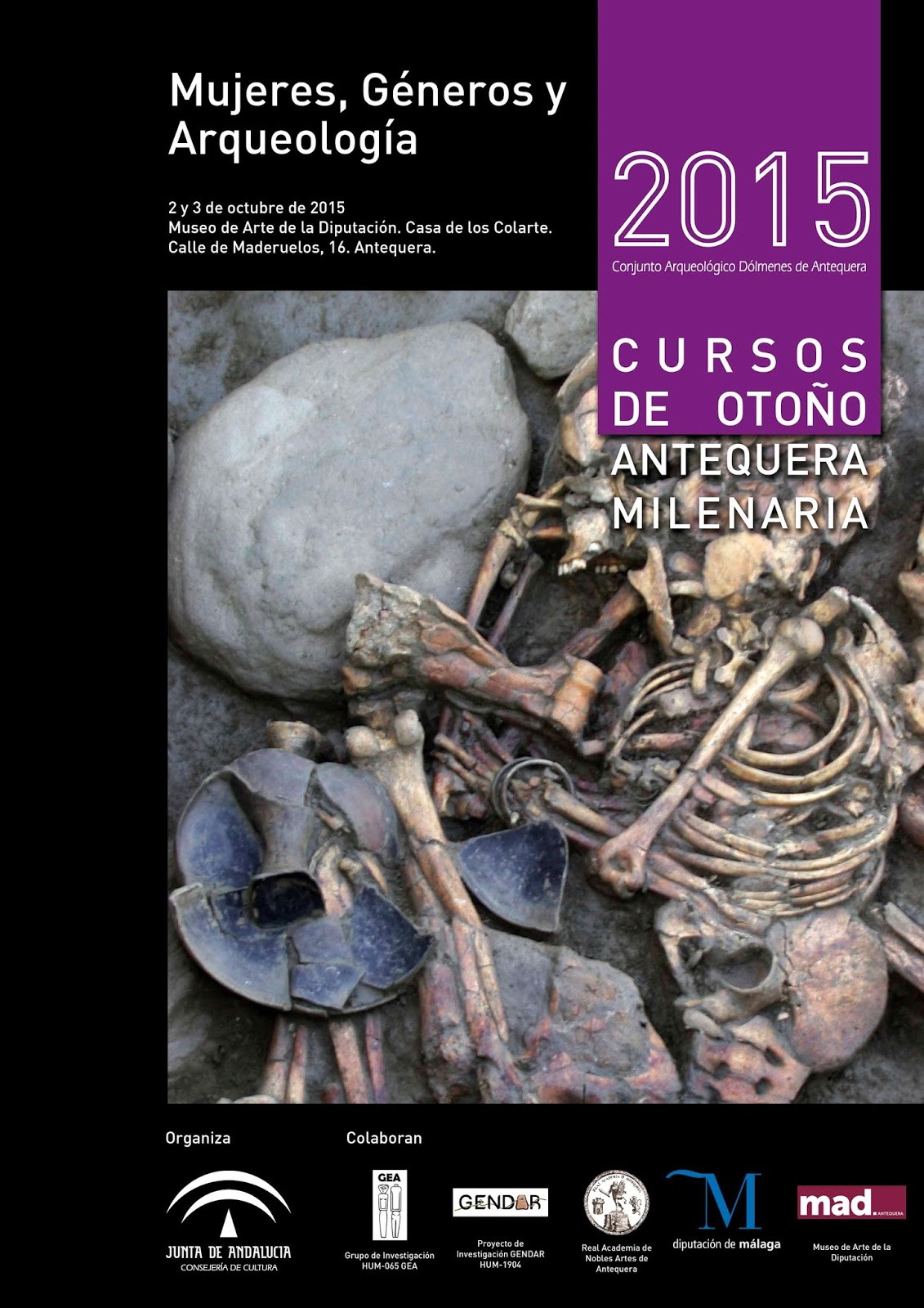 Los cursos de Otoño están organizados por la Consejería de Cultura de la Junta de Andalucía a través del Conjunto Arqueológico Dólmenes de Antequera cuenta con la colaboración del Grupo de investigación HUM-065 GEA, el Proyecto de Investigación GENDAR HUM-1904, la Diputación Provincial de Málaga a través del Museo de Arte de la Diputación así como la Real Academia de Nobles Artes de Antequera.