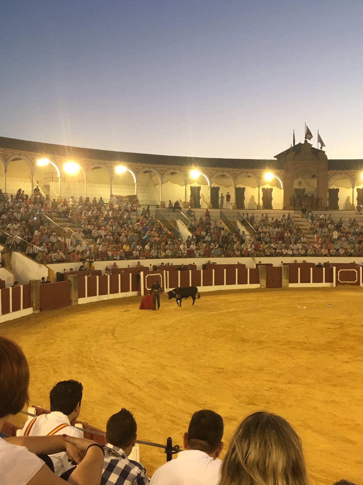 A las nueve y media de la noche comenzaba la corrida. El primer alumno, pese a ser revolcado por el toro en alguna ocasión sin gravedad, realizó una gran faena. A pesar de la insistencia del público que pidió la segunda, consiguió una oreja para terminar la primera faena.