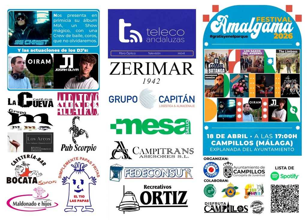La Asociación Amalgama y la Concejalía de Juventud del Ayuntamiento de Campillos ultiman los preparativos para la celebración de una nueva edición del Festival Amalgama. El evento musical, consolidado como una cita de referencia en la agenda cultural del municipio, tendrá lugar este sábado 18 de abril a partir de las 17:00 horas en la explanada del consistorio.