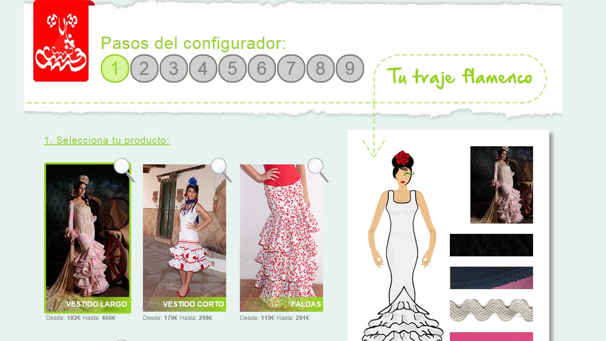 Otro de los factores que la diferencian es la posibilidad de diseñar una misma su vestido de flamenca. A través de su web y su configurador se puede modificar todos los aspectos que componen una prenda (mangas, escote, adornos, telas, medidas). Una opción muy útil y económica, ya que diseñar un traje cuesta lo mismo que comprar uno ya hecho. Y tan solo hay esperar 10 días para tenerlo.