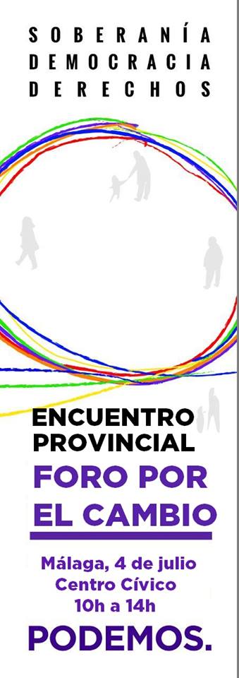 Como paso previo al Foro por el Cambio, que se celebra en Madrid el 11 de julio, en Málaga se ha organizado un encuentro provincial de preparación el próximo sábado en el Centro Cívico (Sala Mijas), de diez de la mañana a dos de la tarde. En este encuentro previo participará una delegación de Podemos Antequera, formada por miembros del Consejo Ciudadano y otros componentes del Círculo. Además, pueden participar todas las organizaciones, activistas sociales, inscritos, simpatizantes y ciudadanos y ciudadanas en general.