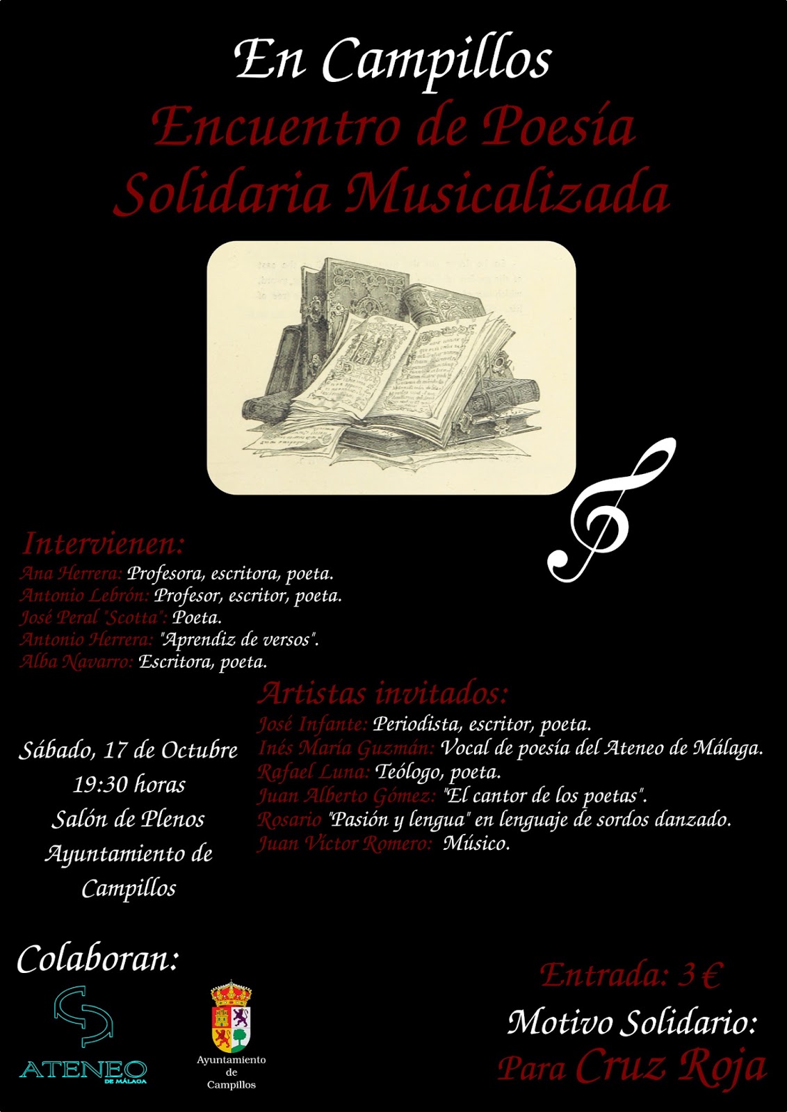 Este encuentro con la poesía dará comienzo a las 19:30 horas, las entradas costarán tres euros y la recaudación se destinará íntegramente a Cruz Roja. La organización del evento cuenta con la colaboración de la Concejalía de Cultura del Ayuntamiento de Campillos y del Ateneo de Málaga.