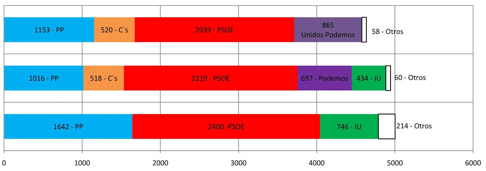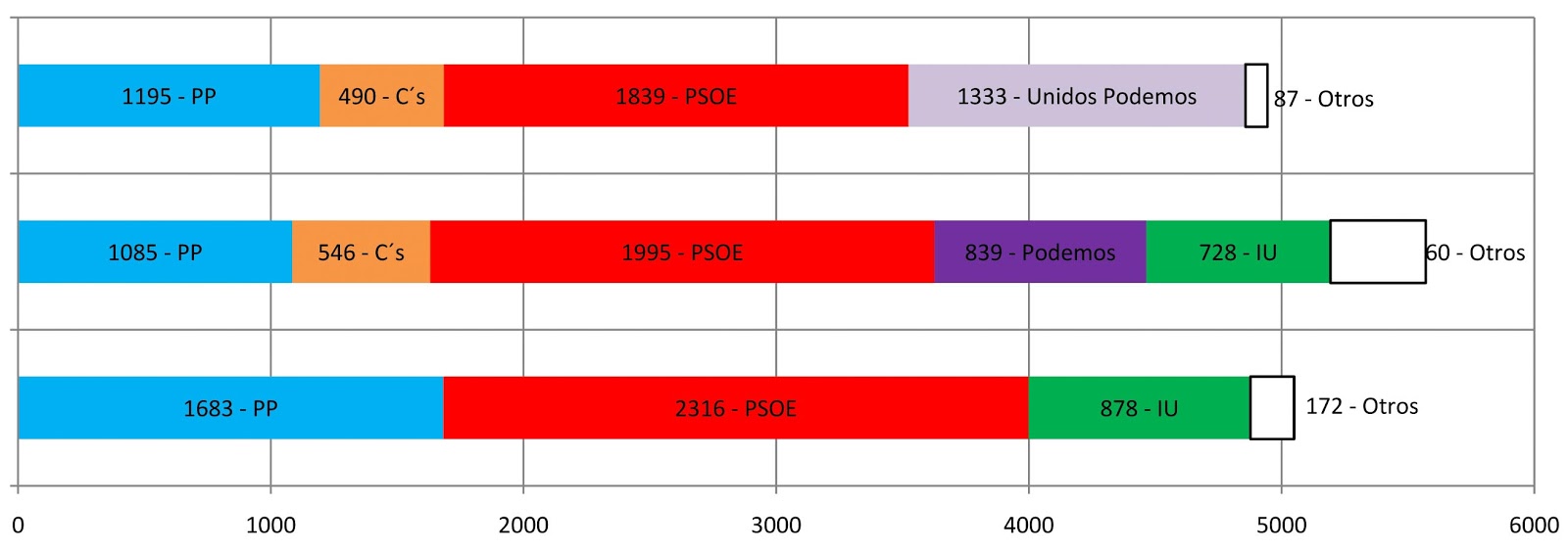 | Congreso Campillos – Ordenados de arriba abajo: Elecciones 2016, 2015 y 2011 |